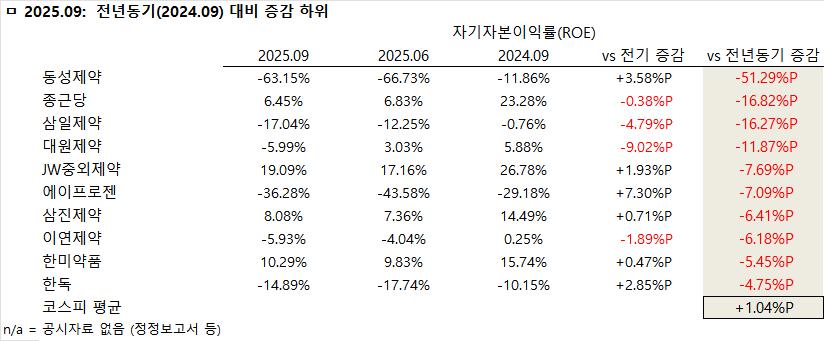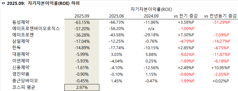 자기자본이익률 하위는 동성제약이 -63.15%로 유일하게 -60%를 넘었으며, 에이프로젠바이오로직스가 -57.20%를 기록하며 -50%를 넘었다. 이어 에이프로젠(-36.28%), 삼일제약(-17.04%), 한독(-14.89%)이 '하위 5'에 들었다.