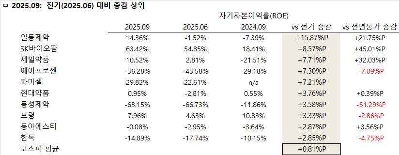전기(2025년 2분기) 대비 증가율은 일동제약이 15.87%P로 유일하게 10%를 넘으며 가장 높았고, SK바이오팜(8.57%), 제일약품(7.71%P), 에이프로젠(7.30%P), 파미셀(7.21P)이 ’톱5‘에 들었다. 한독은 2.85%P로 10위에 합류했다. 상위 10개 기업 모두 평균(0.81%P)보다 3배이상 높았다.