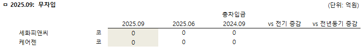 2025년 3분기 누적 기준 세화피앤씨와 케어젠은 차입금이 없는 것으로 나타났다.