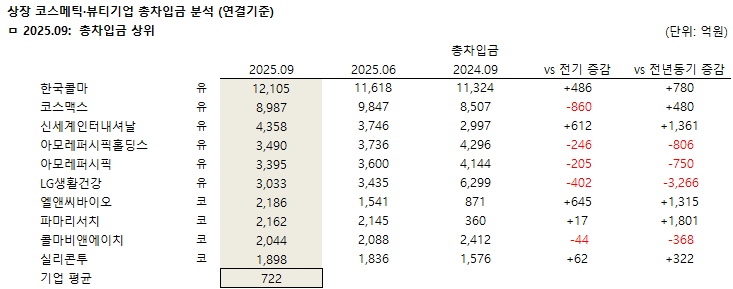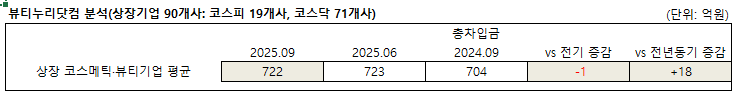 약업신문 자매지 화장품신문이 금융감독원 공시 2025년 11월 분기보고서(연결기준) 분석 결과, 상장 화장품 기업 90개사(코스피 19개사, 코스닥 71개사)의 2025년 3분기 누적 총차입금액 평균은 722억원으로 전기(이하 1~6월) 723억원 대비 1억원 감소했으나, 전년동기보다는 18억원 증가했다.