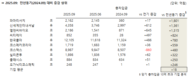 코스메카코리아(+559억원), 코스맥스(+480억원), 실리콘투(+322억원), 클래시스(+250억원), 오가닉코스메틱(+246억원) 도 전년동기 대비 총차입금액 증가폭이 큰 편이다.
