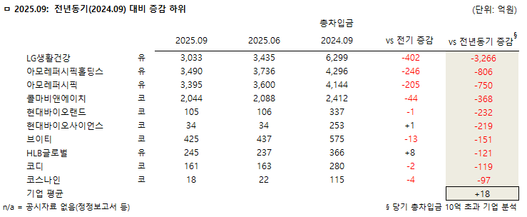 ◇ 2025년 3분기 누적 총차입금액 전기대비 감소액 상위 10개사