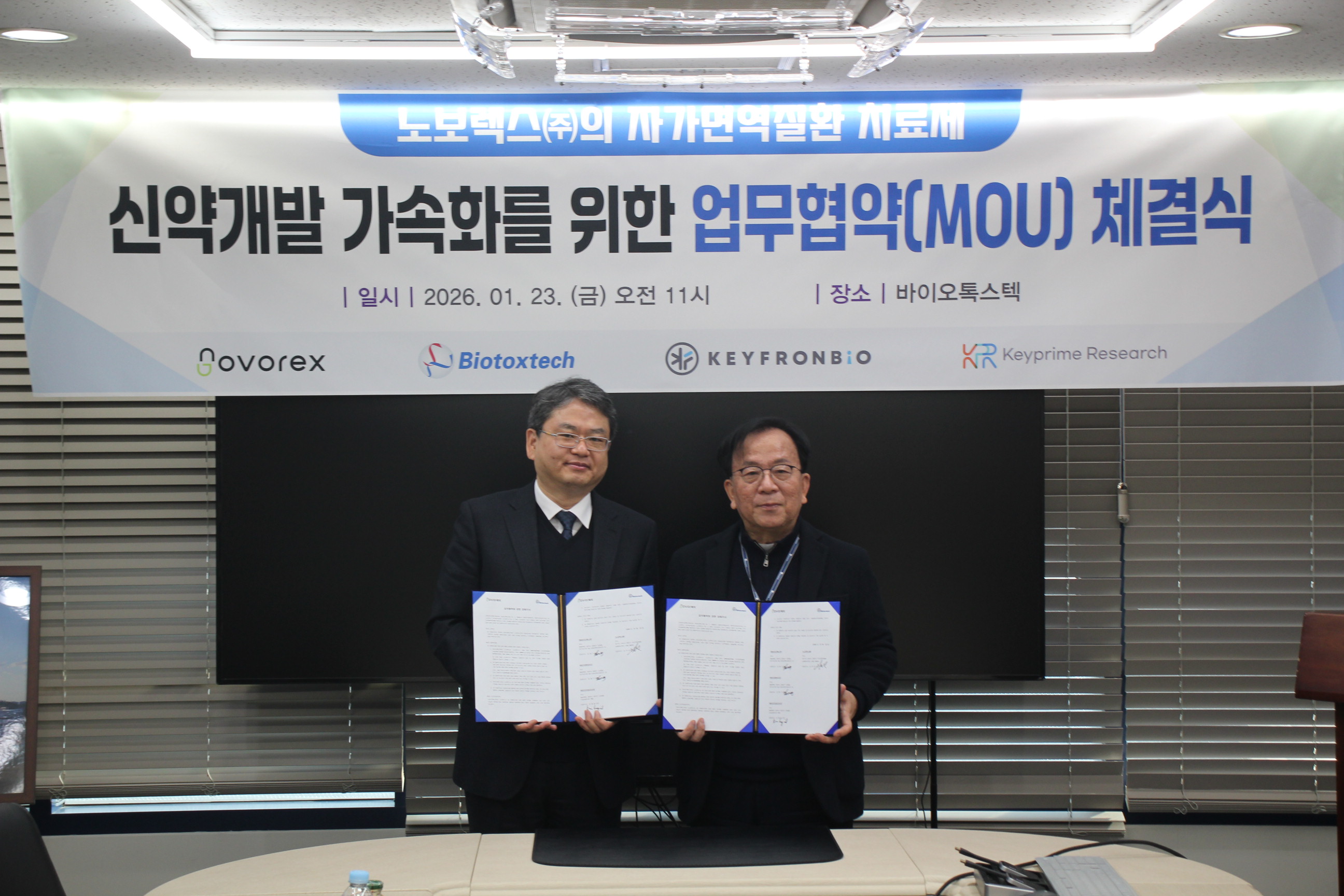 비임상시험수탁기관(CRO)인 바이오톡스텍(대표이사 강종구)은 관계사인 키프론바이오와 키프라임리서치와 함께 혁신 신약 개발 기업 노보렉스(대표이사 손우성)와 신약개발 가속화를 위한 전략적 협력 강화를 목적으로 양해각서(MOU)를 23일 체결했다고 밝혔다.