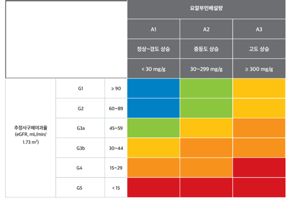 만성콩팥병은 CGA 체계(Cause: 원인, GFR: 사구체여과율, Albuminuria: 알부민뇨)에 따라 분류하며 이 세 가지 요소를 종합해 질환의 단계와 위험도를 평가한다. 이 중 사구체여과율 단계(G1–G5)와 알부민뇨 단계(A1–A3)를 결합한 위험도 지도(heat map)는 환자의 사망, 신부전, 급성 신손상, 심혈관질환 발생 위험을 직관적으로 보여주는 도구로 널리 활용되고 있다. 위험도 지도는 사구체여과율이 감소하고 알부민뇨가 증가할수록 위험 수준이 녹색(낮음) → 노란색(중등도) → 주황색(높음) → 빨간색(매우 높음)으로 상승한다(그림 3).