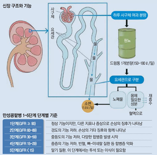 신장의 기능은 사구체여과율로 측정한 뒤 5단계로 구분하는데, 3단계부터는 고혈압, 빈혈, 전해질 이상이 나타나기 시작하며, 4~5단계는 합병증 관리와 투석이 필요하다(그림3).