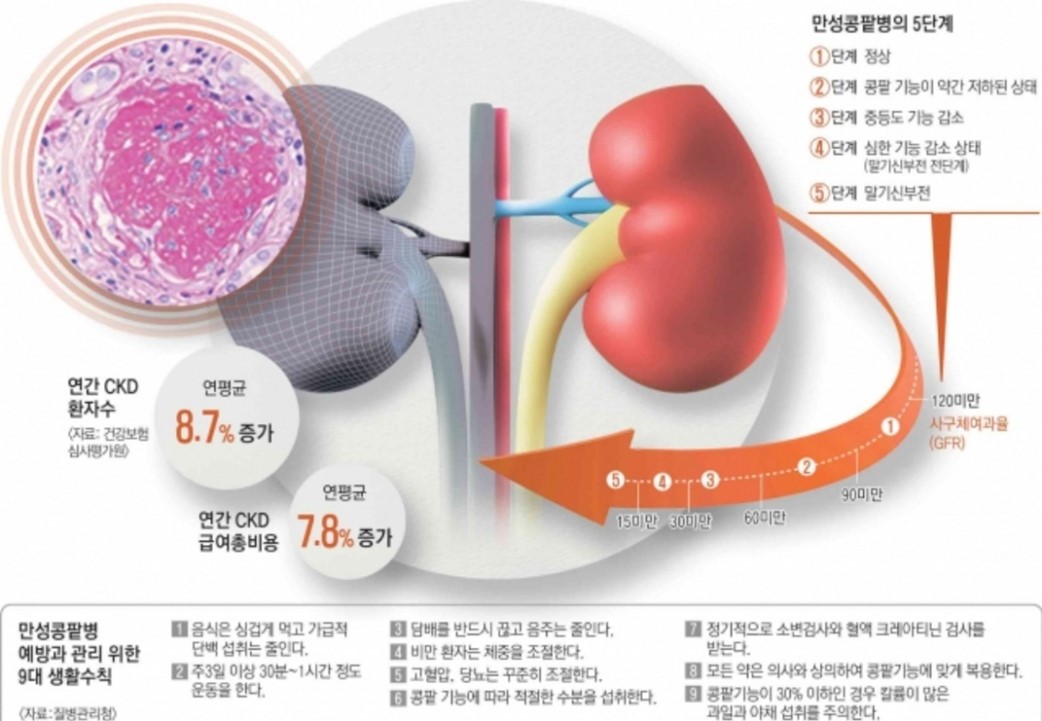 투석, 이식 같은 신대체요법 | - 다양한 치료에도 불구하고 CKD로 진행하면, 신장이식이나 투석 시행 - 신장질환자는 부작용이 증명되지 않은 약물(한약, 민간요법 등) 사용 주의 |