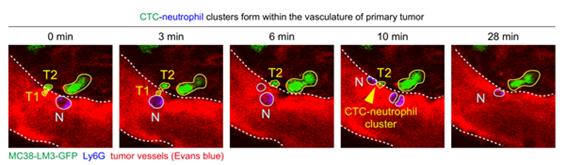 이번 연구(Wang S, et al. Gut 2026)는 대장암의 간 전이를 촉진하는 핵심 동력인 ‘순환 종양 세포(CTC)-호중구 클러스터’가 원발암 혈관 내에서 형성되는 과정을 다루고 있다. 연구팀은 아이빔테크놀로지 생체현미경을 활용해, 살아있는 생쥐 종양 혈관 내에서 암세포와 호중구가 역동적으로 상호작용하며 클러스터를 형성하고 혈류로 유입(Intravasation)되어 전신 순환계로 진입하는 역동적인 과정을 실시간으로 증명해냈다.