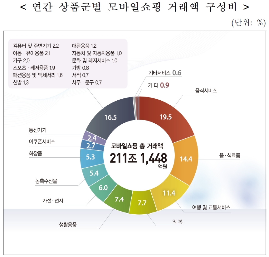 모바일쇼핑에서도 농축수산물(+16.2%), 음·식료품(+14.1%) 등 식품과 음식서비스(+12.2%) 거래액 증가가 돋보였다. 통신기기(+10.4%), 도서(서적 및 사무·문구 +10.8%), 문화 및 레저서비스에서도 거래액이 두 자릿수 증가했다. 반면 이쿠폰서비스(-15.8%)는 모바일쇼핑 거래액도 크게 감소했다.