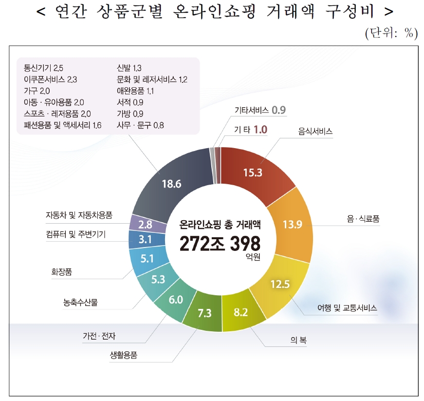 전체 품목 중에선 음식서비스(전년 대비 +12.2%)와 농축수산물(+12.9%), 음·식료품(+9.5%) 등의 식품과 자동차 및 자동차용품(+30.5%)에서 온라인 거래액이 가장 많이 증가했다. 두드러지게 거래액이 하락한 품목은 이쿠폰서비스(-27.5%)다.
