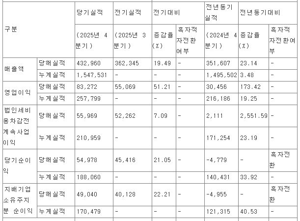 4분기는 매출 4326억6천만원, 영업이익 832억7천만원, 당기순이익 549억7천만원으로 전기대비 각각 19.49%, 51.21%, 21.0% 각각 늘었다.