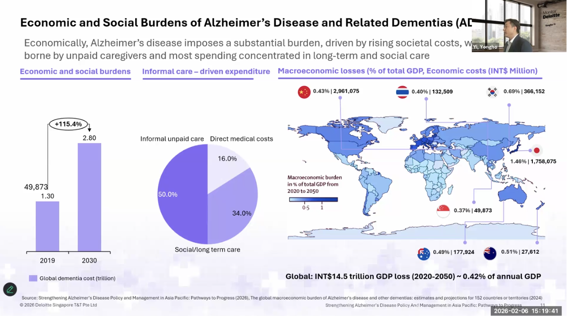 딜로이트 이용호 이사는 “알츠하이머병은 증상이 나타난 뒤에 대응하는 질환이 아니라, 증상이 나타나기 훨씬 이전 단계에서 이미 사회적 비용이 누적되기 시작하는 질환”이라며 “알츠하이머병은 의료 문제가 아니라 사회 시스템의 문제”라고 지적했다.