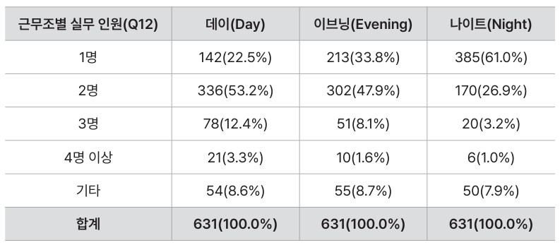 최근 국회에서 열린 간호·간병통합서비스 제도 개선 토론회에서 대한간호조무사협회 사창우 정책국장이 발표한 ‘통합병동 간호조무사 근무 현황 실태조사’ 결과에 따르면, 응답자의 61.0%는 야간 근무 시 1인이 병동 전체를 담당하고 있다고 답했다. 야간에 별도 지원 인력이 없다는 응답도 41.5%에 달했다.