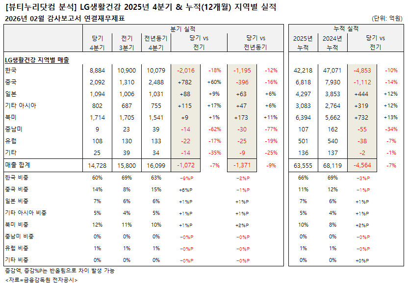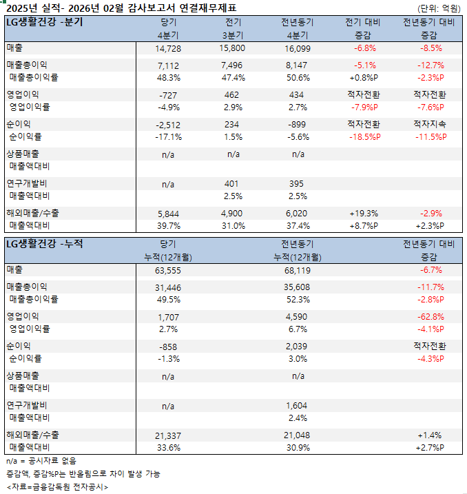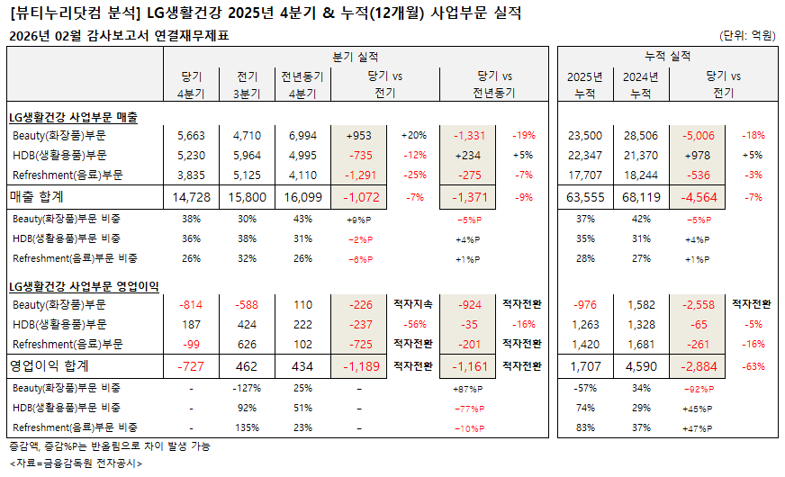 약업신문 자매지 화장품신문이 금융감독원 공시 2026년 2월 감사보고서(연결기준) 분석 결과, LG생활건강 전 사업 부문의 지난해 매출은 6조3555억원으로 2024년 6조8119억원 대비 6.7% 감소했다. 영업이익은 1707억원에 그쳐 전년 4590억원 대비 62.8% 역성장했다. 858억원의 순손실을 기록, 2039억원의 영업이익을 올렸던 전년대비 적자전환했다.