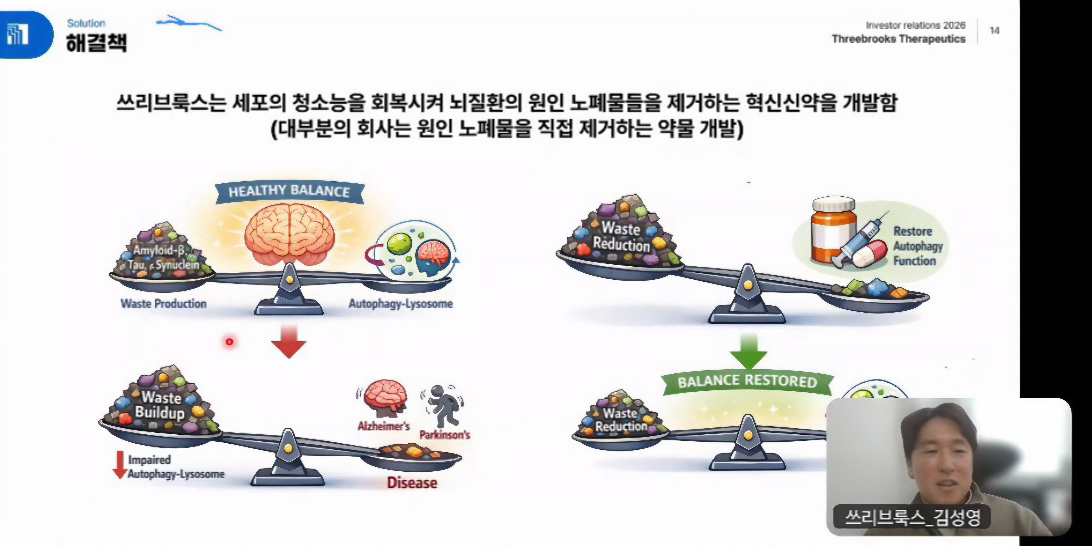 “현재 항체 치료제는 병리 단백질 자체를 제거하는 접근입니다. 반면 쓰리브룩스테라퓨틱스는 병리 단백질을 제거하는 세포의 기능 자체를 복원하는 전략입니다. 즉, 세포 내부의 ‘청소 시스템’을 회복시켜 세포가 스스로 축적된 아밀로이드 베타와 타우, 손상된 미토콘드리아를 제거할 수 있도록 하는 접근입니다.”