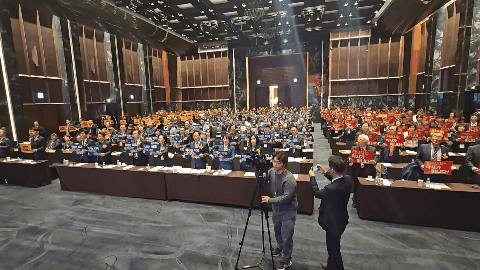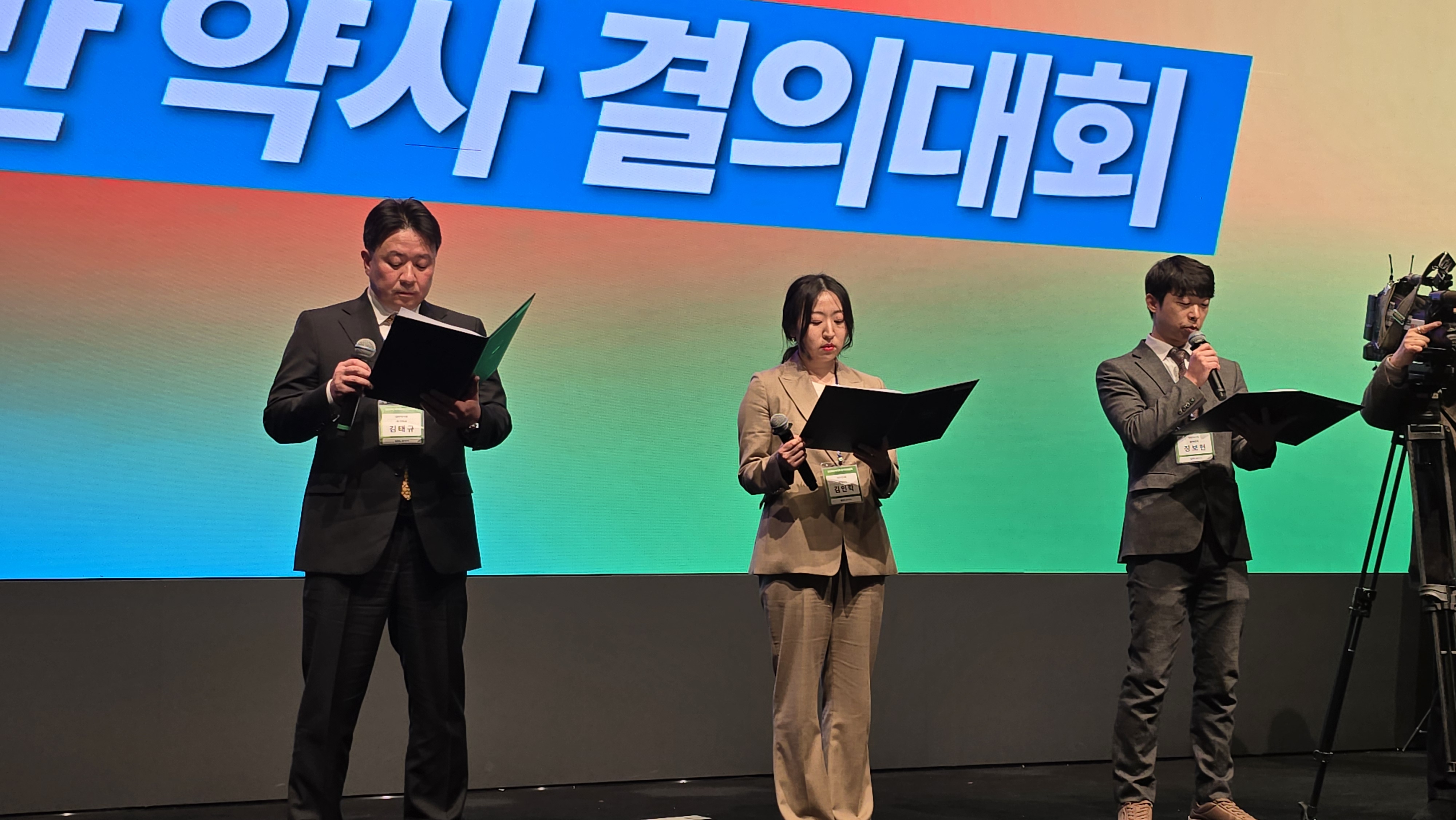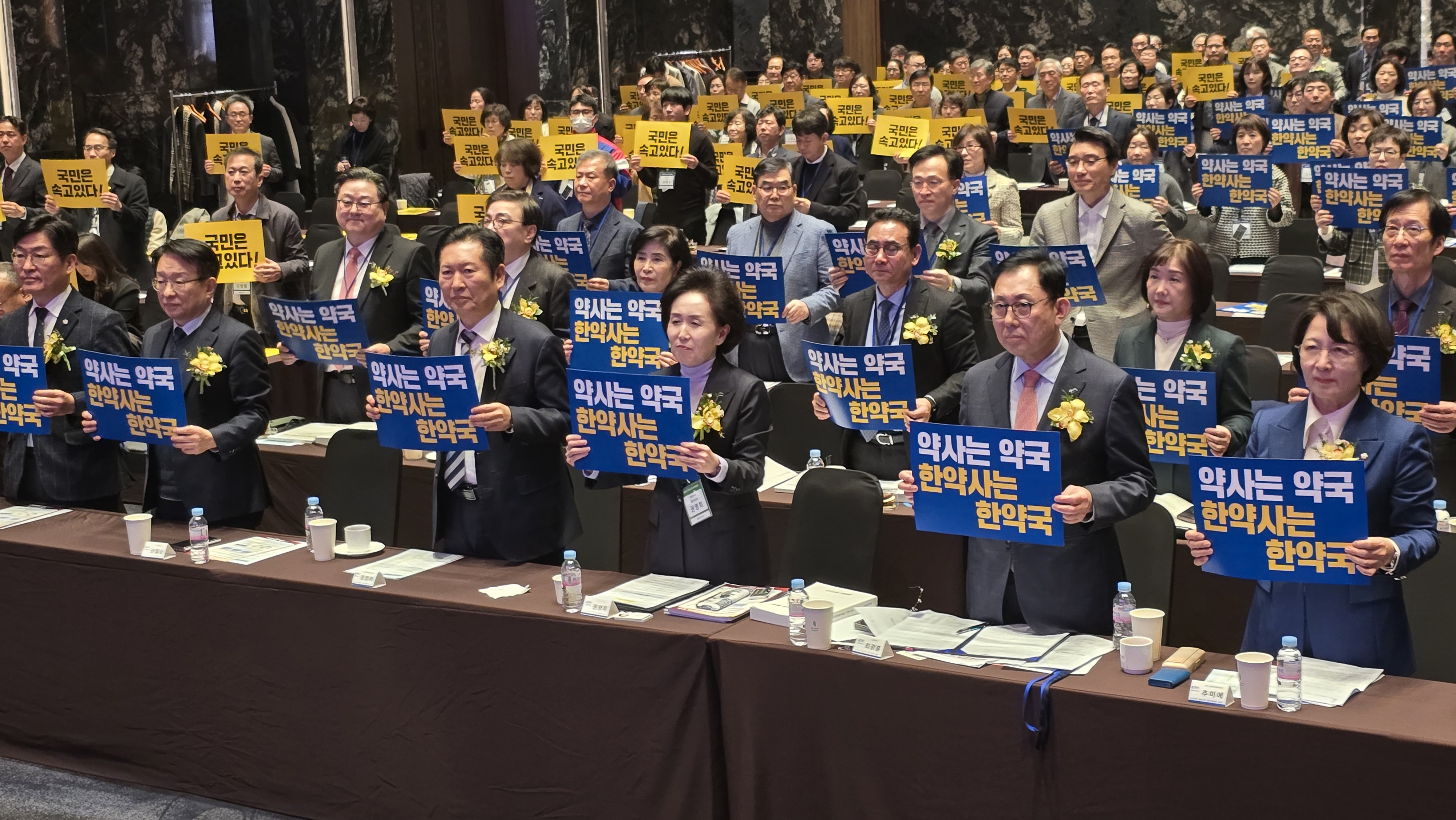 이날 대의원들은 전원 기립해 피켓을 가슴 높이에서 힘 있게 내밀며 “약사-한약사 면허범위 바로 세워 국민 건강 보장하라”, “자본 종속 창고형 약국 차단하라”, “품절의약품 성분명 처방 즉각 실시하라” 등 구호를 외쳤다.