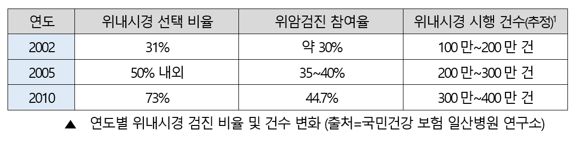 업계에서는 이번 정책 전환이 2000년대 초 국가암검진에 위내시경이 도입됐던 시기와 유사한 파급효과를 가져올 수 있다고 분석하고 있다. 2002년 국가암검진 사업 도입 이후 위암 검진 방식으로 내시경을 선택하는 비중은 꾸준히 상승했고, 2000년대 중반부터는 상급종합병원은 물론 지역 종합병원과 검진센터까지 장비 도입이 확대되면서 검사 건수가 구조적으로 증가했다.