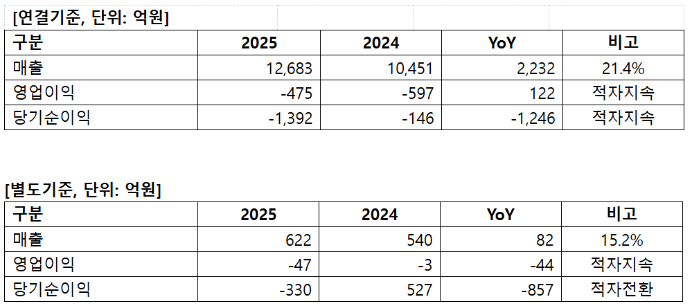당기순손실은 1392억원이다. 최근 주가 상승에 따른 전환사채(CB), 신주인수권부사채(BW), 교환사채(EB), 상환전환우선주(RCPS) 등의 공정가치 평가손익, 회계상 이자 비용, 환율 변동에 따른 환차손 등 비현금성 회계요인이 반영됐다. 회사 측은 발행한 CB, BW, RCPS의 상당 부분이 현재 주식으로 전환돼 관련 부담은 상당 부분 해소됐다고 설명했다.