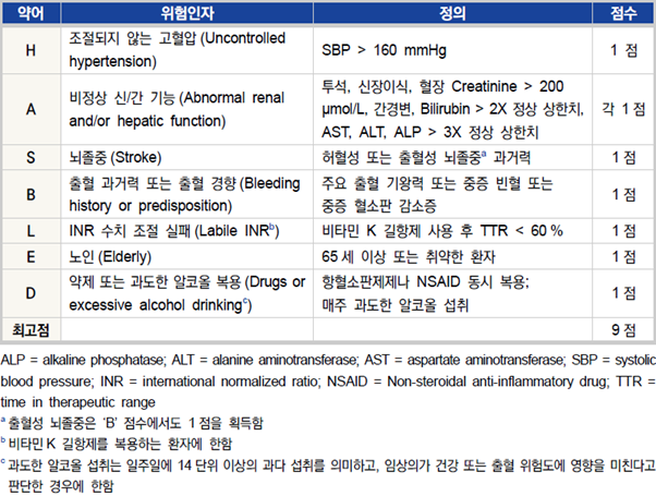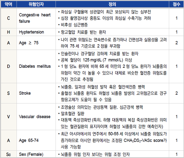 항응고제를 사용할 때는 뇌졸중 위험도 평가를 위해 CHA₂DS₂-VASc 점수(표2)를 고려하여 치료를 시작한다. 또한, HAS-BLED 점수(표3)를 통해 출혈 위험을 평가하며, 환자의 출혈 위험을 최소화할 수 있도록 관리한다