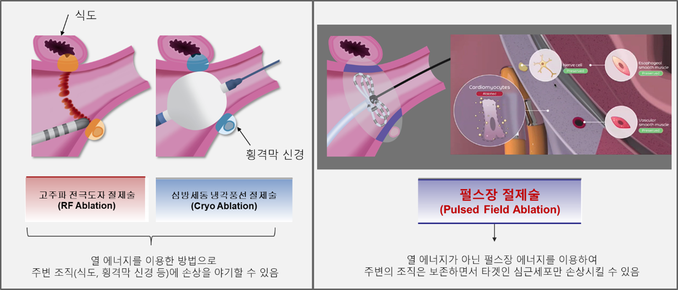 1) 고주파 전극도자 절제술(Radiofrequency Ablation): 전통적으로 가장 널리 사용되어 온 방법으로, 고주파 열 에너지를 이용해 심근 조직을 괴사시켜 심방에 비정상적인 전기 신호를 차단한다.