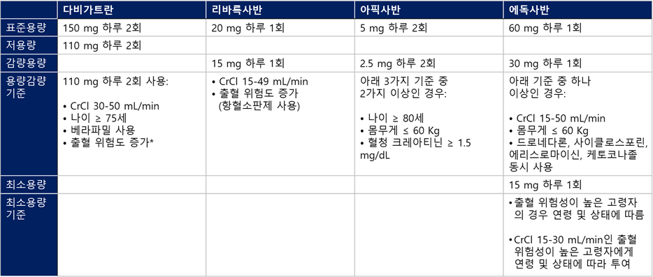 심방세동 환자는 혈전 형성의 위험이 높기 때문에, 뇌졸중 예방을 위해 항응고제가 필수적이다. 현재 가장 널리 사용되는 항응고제는 NOAC (Dabigatran, Rivaroxaban, Apixaban, Edoxaban)이며, 이들 약물은 와파린보다 관리가 용이하고, 출혈의 위험을 줄이는 장점이 있다. 각 약제의 용량 선택 기준은 아래 표1과 같다.