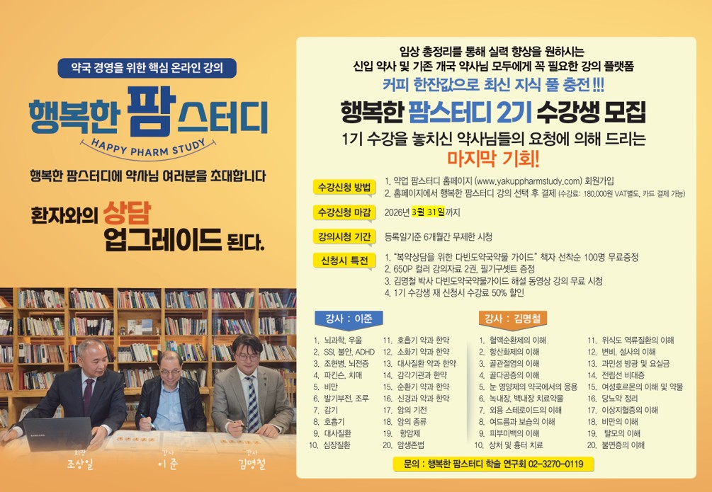 ‘상담 실력’이 곧 ‘약국 경쟁력’이라는 메시지를 다시 한번 내세운 이번 행복한 팜스터디 2기 수강 신청은 3월 31일까지 진행되며, 약업 팜스터디 홈페이지(www.yakuppharmstudy.com)를 통해 접수할 수 있다. 모집 인원은 선착순으로 운영된다.