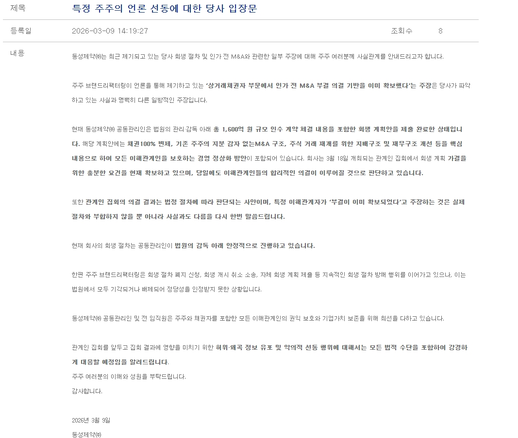 9일 동성제약은 홈페이지에 공식 입장문을 게재하고 “최근 특정 이해관계자가 ‘부결이 이미 확보되었다’고 주장하는 것은 실제 법적 절차와 전혀 부합하지 않는 왜곡된 정보”라고 일축했다. 이어 “이러한 악의적인 선동 행위에 대해서는 모든 법적 수단을 동원해 강경하게 대응할 예정”이라고 밝혔다.