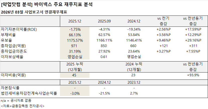 2026년 3월 공시된 바이넥스의 사업보고서 연결재무제표에 따르면, 지난해 바이넥스 주요 재무지표에서 ROE는 개선됐으나 부채 및 차입 관련 지표는 상승했다.