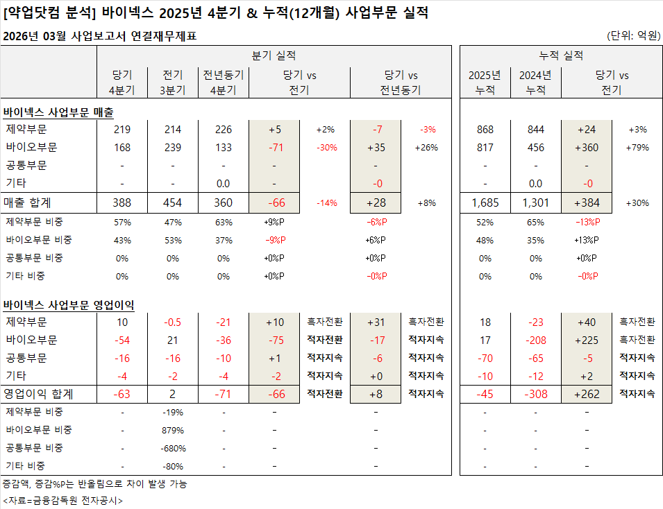 바이넥스는 2025년 바이오부문 성장에 힘입어 연간 매출이 늘었지만, 4분기에는 바이오부문 수익성 둔화로 영업적자를 기록한 것으로 나타났다. 바이넥스 지난해 누적 기준 사업부문 매출은 제약부문보다 바이오부문이 더 큰 폭으로 늘었다.