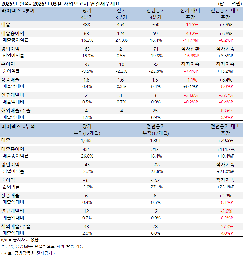 바이넥스는 2025년 매출과 수익성이 동시에 개선됐으나 영업적자는 이어진 것으로 나타났다.