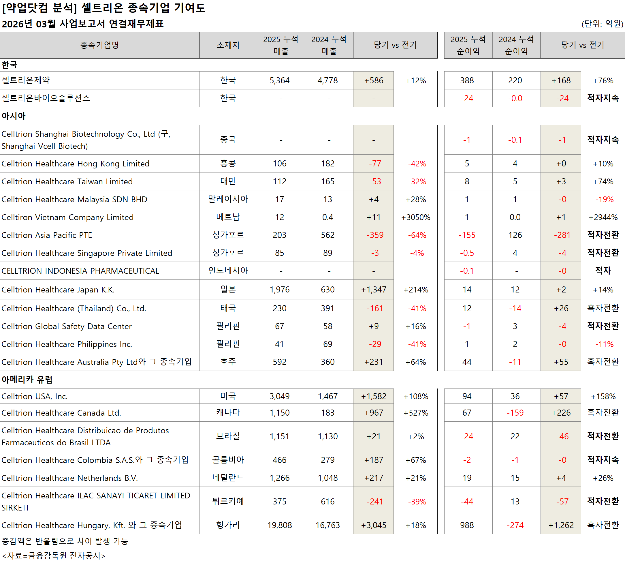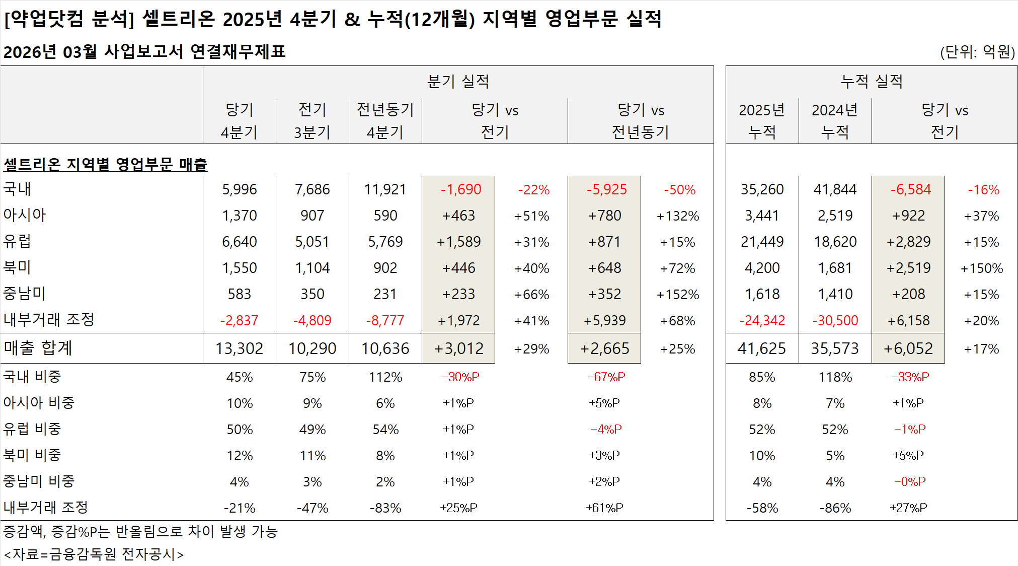 셀트리온은 내부거래 축소와 해외 매출 확대를 동시에 달성했다. 유럽 매출은 2조1449억원으로 전년 대비 2829억원 증가하며 15% 성장했다. 전체 매출의 52%를 차지하며 여전히 핵심 시장 지위를 유지했다.