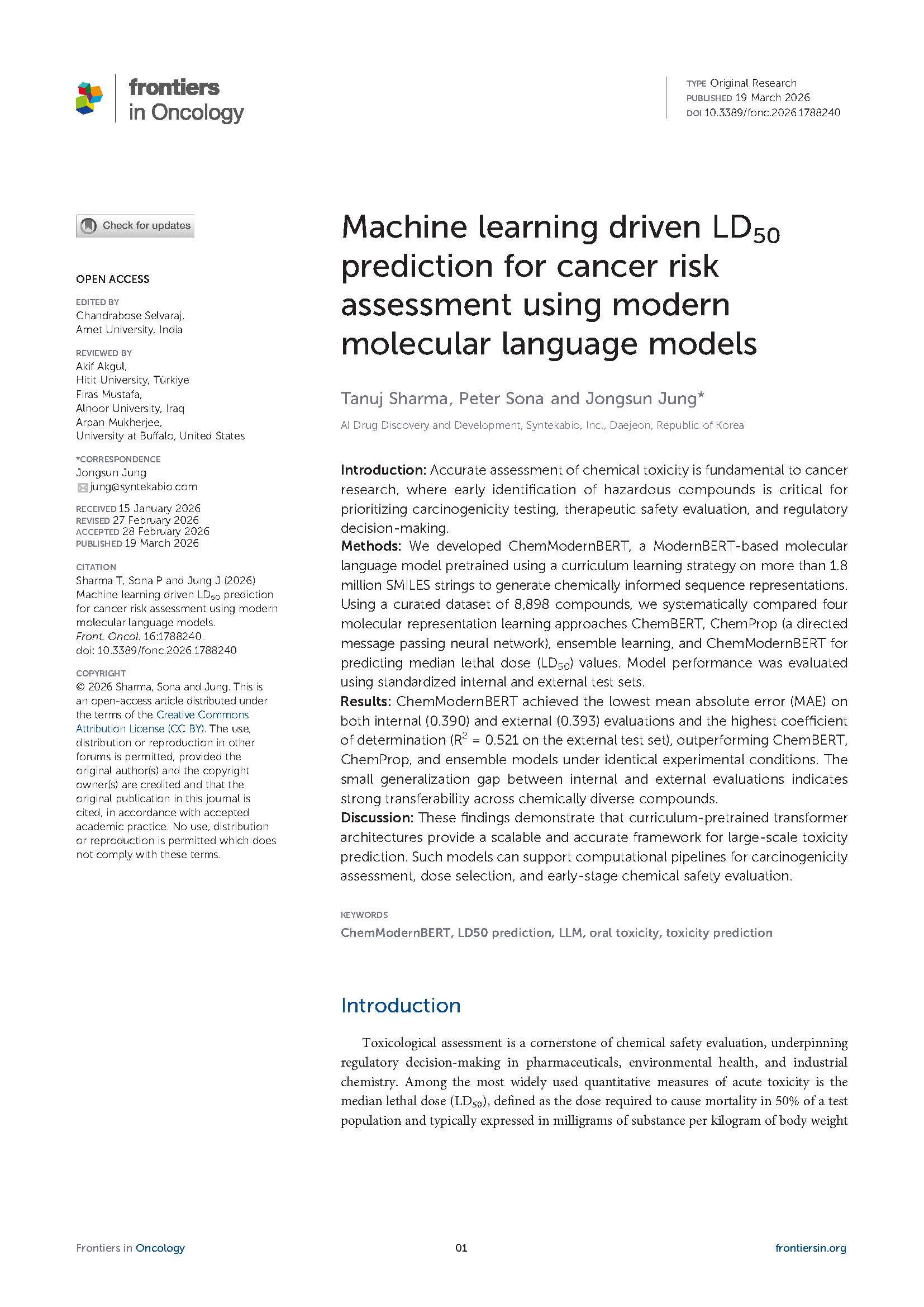 AI 신약개발 기업 신테카바이오는 인공지능(AI) 기반 분자 언어모델을 활용해 화학물질의 경구 독성(LD₅₀)을 예측하는 연구 논문이 국제 SCI 학술지 Frontiers in Oncology에 게재됐다고 23일 밝혔다.