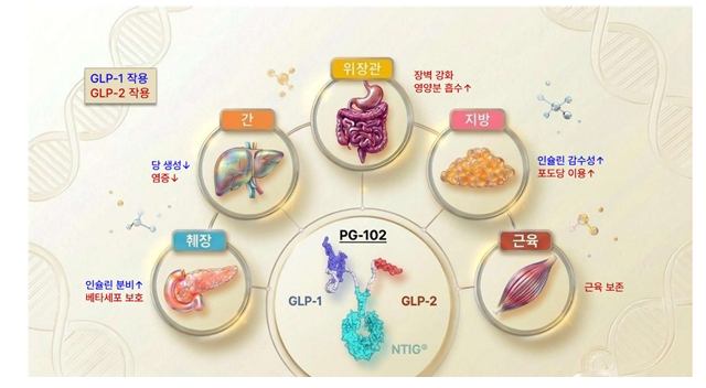 주목할 점은 이러한 강력한 혈당 강하가 체중과 근력을 감소시키지 않고 나타났다는 점이다. PG-102는 고혈당 상황에서도 체중을 안정적으로 유지하면서 혈당을 정상 범위로 회복시키는 특성을 보였다. 이는 혈당 강하와 체중 감소가 필연적으로 연결된 기존 GLP-1 치료 개념을 바꾸는 새로운 연구 결과로, GLP-1 효능을 유지하면서 GLP-2 작용을 통해 체중·근육·대사 손실 부담을 보완하도록 설계된 PG-102의 차별적 기전을 반영한다고 연구팀은 설명했다.