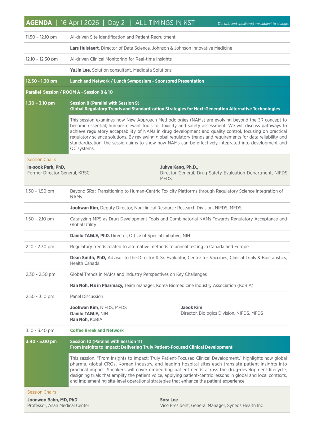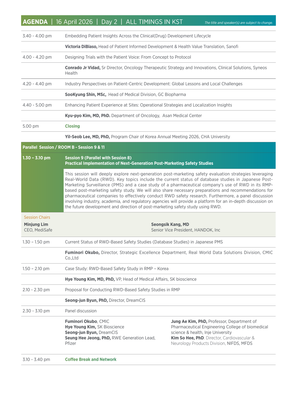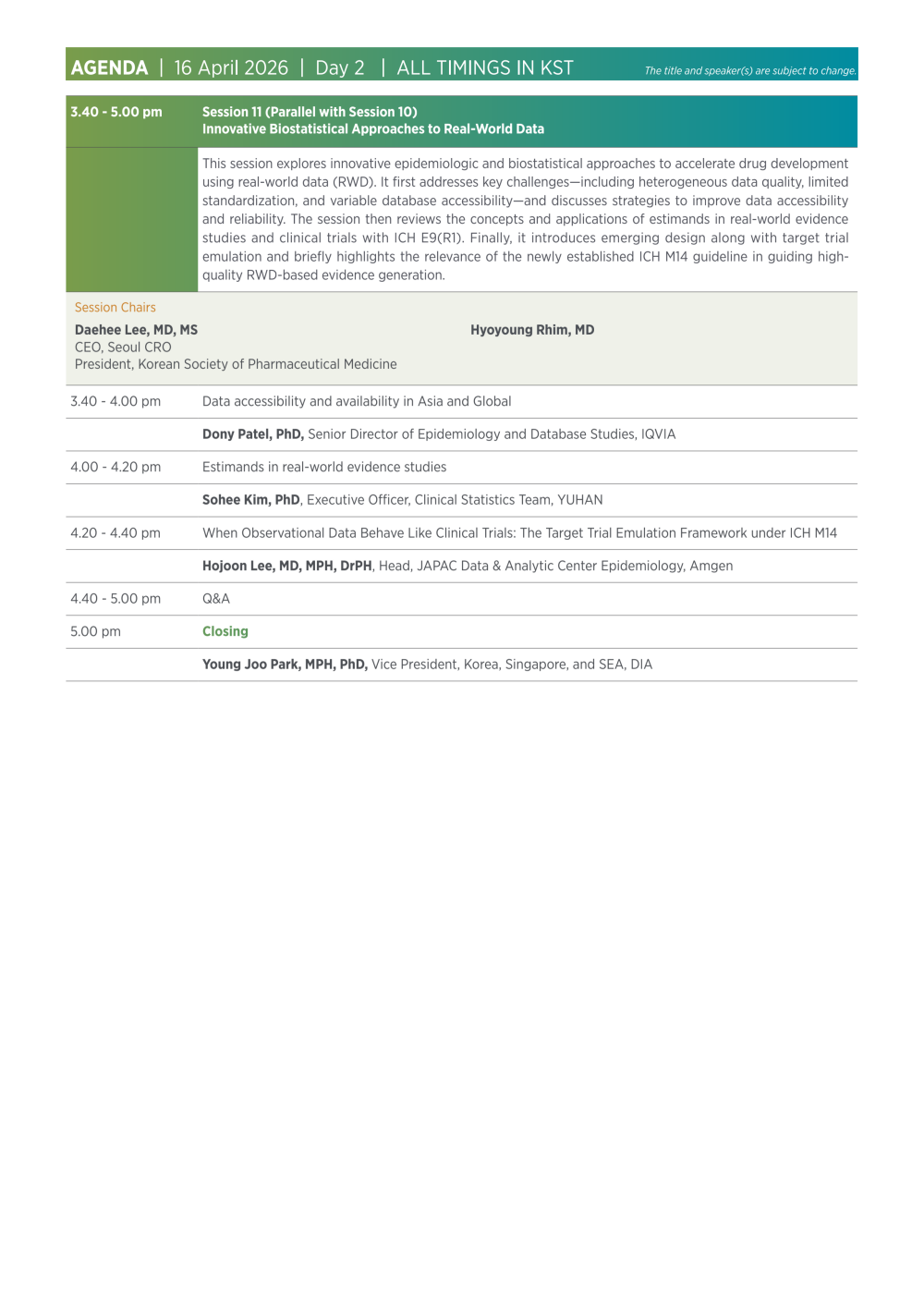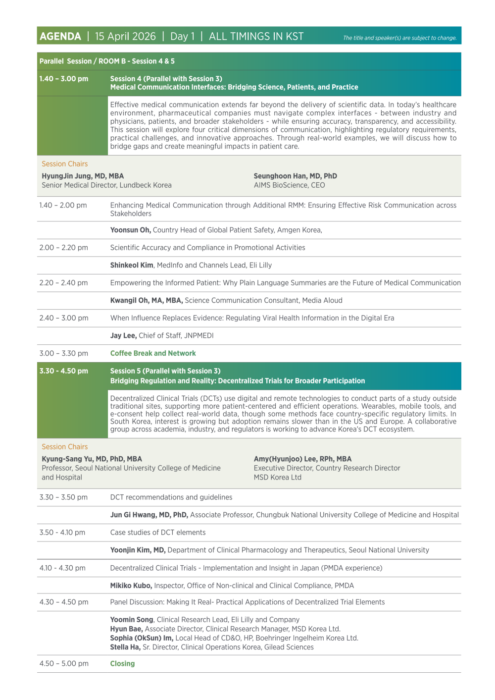 이를 통해 참가자들은 글로벌 임상개발 환경 변화 속에서 효율적이고 환자 중심적인 임상시험 운영 전략과 규제 대응 방향에 대한 실질적인 인사이트를 얻을 수 있을 것으로 기대된다.
