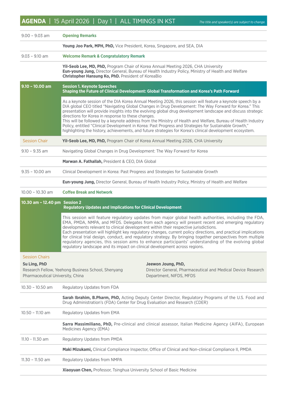 행사 첫째 날에는 글로벌 규제 환경 변화와 임상개발 전략을 중심으로 다양한 논의가 진행된다. 미국 FDA, 유럽 EMA, 일본 PMDA, 중국 NMPA, 한국 식품의약품안전처(MFDS) 등 주요 규제기관 전문가들이 참여해 의약품 개발과 임상시험을 둘러싼 최신 규제 정책과 글로벌 협력 동향을 공유할 예정이다.