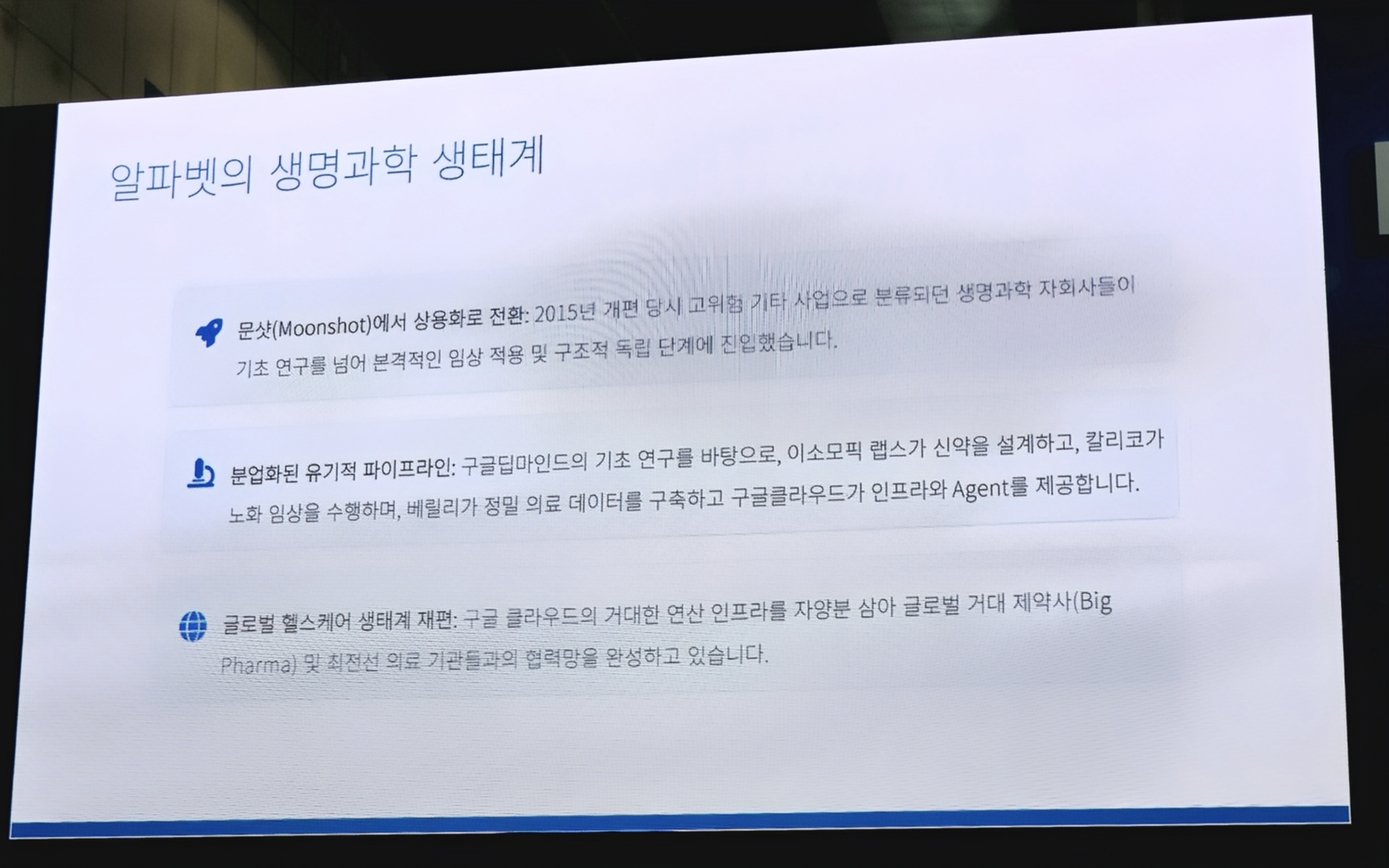 구글 생명과학 전략도 재정비되고 있다. 딥마인드(DeepMind)는 기초 연구, 아이소모픽 랩스(Isomorphic Labs)는 신약 설계, 칼리코(Calico)는 임상 개발을 담당하며 역할이 분명해지고 있다.