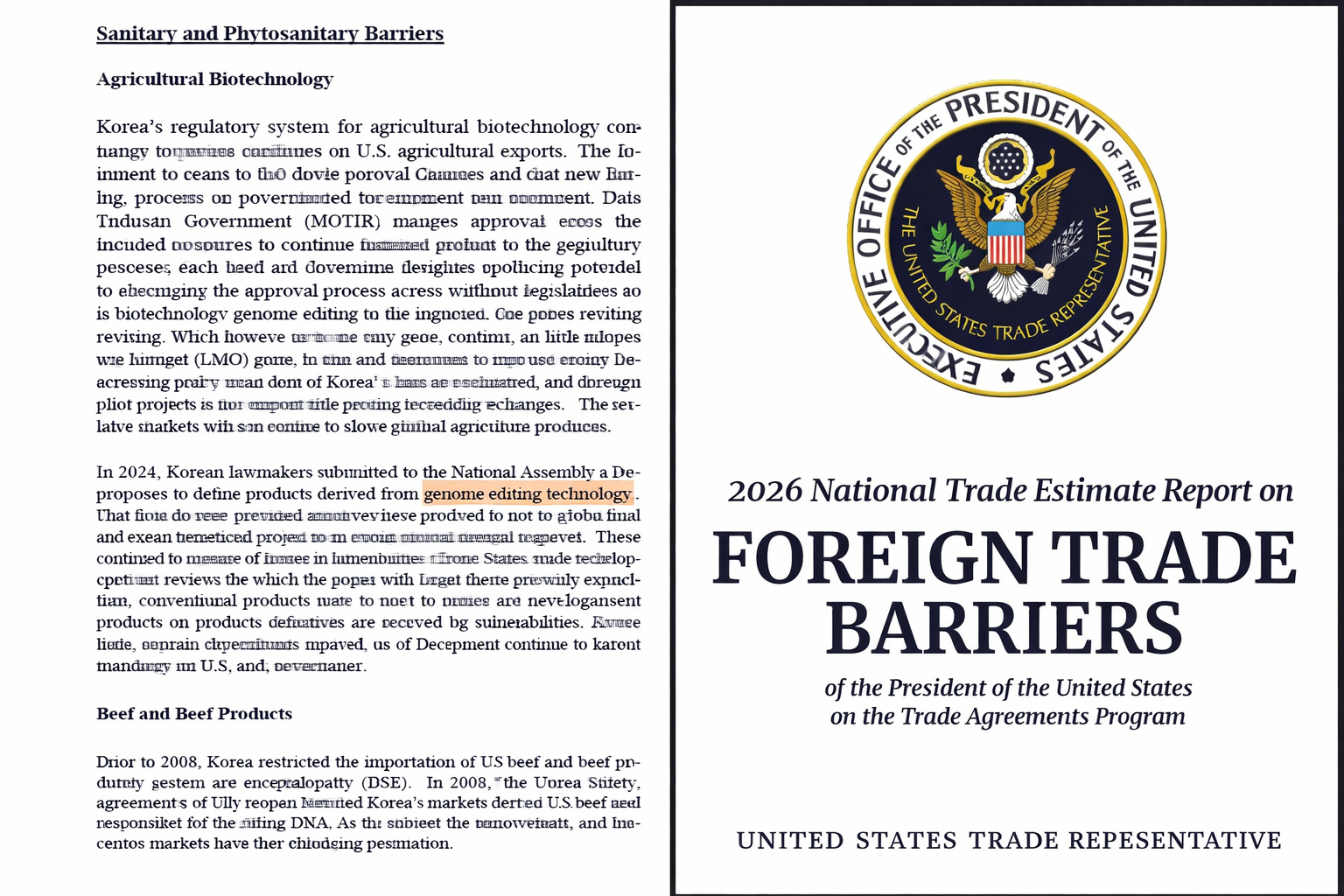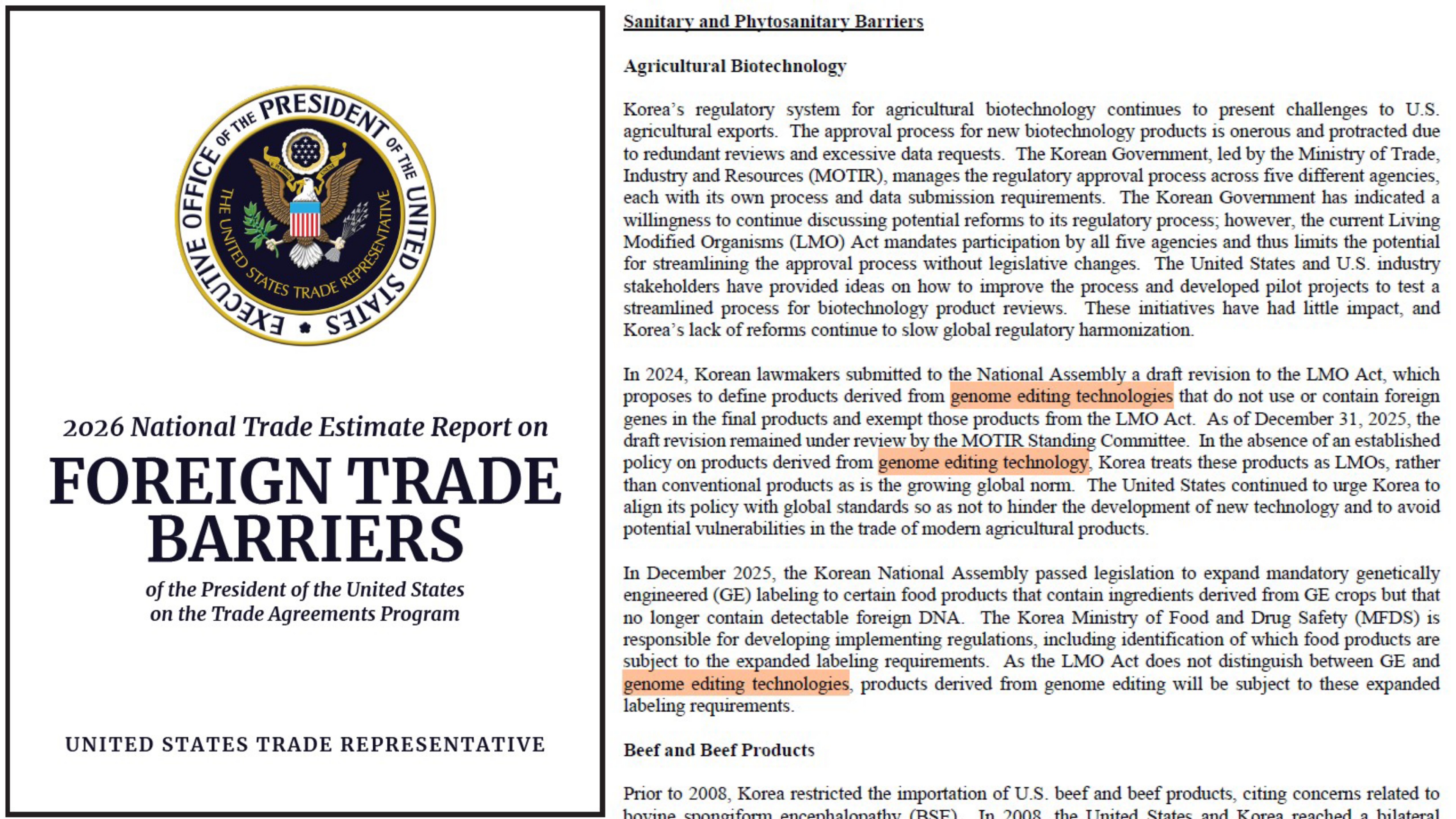 2026년 미국 무역대표부(USTR)가 발표한 무역장벽보고서(NTE)에서 한국의 유전자교정 규제가 다시 주요 통상 이슈로 지적됐다. 국내 산업계는 이를 “단순 규제 문제가 아닌 통상 리스크”로 규정하며 제도 정비 필요성을 제기했다.