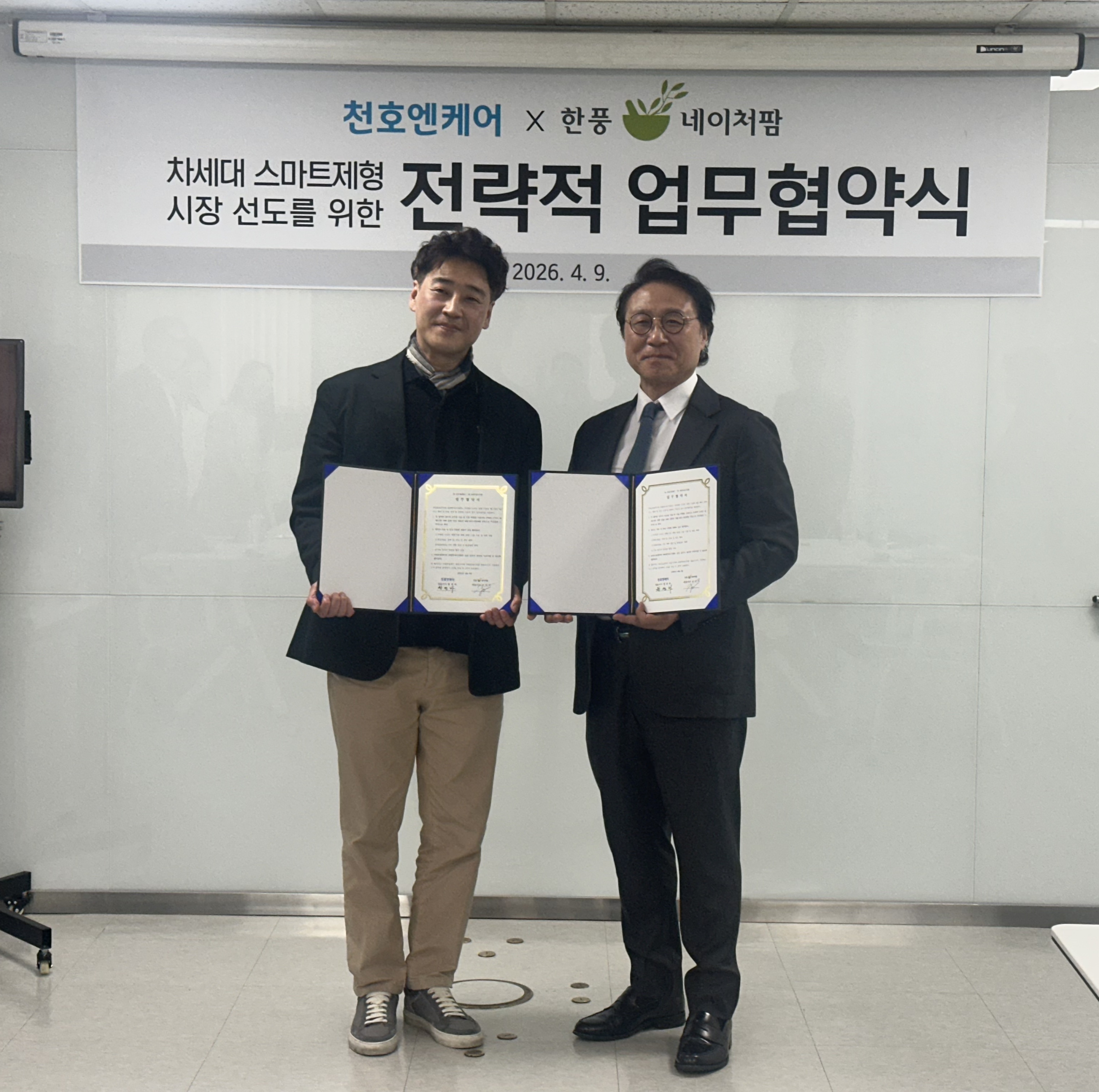 건강기능식품 전문 제조기업 한풍네이처팜(대표이사 조인식, 조형권)이 천호엔케어(대표이사 황연하)와 9일 천호엔케어 서울 본사에서 스마트 이중제형 개발 협력을 위한 업무 협약(MOU)을 체결했다.