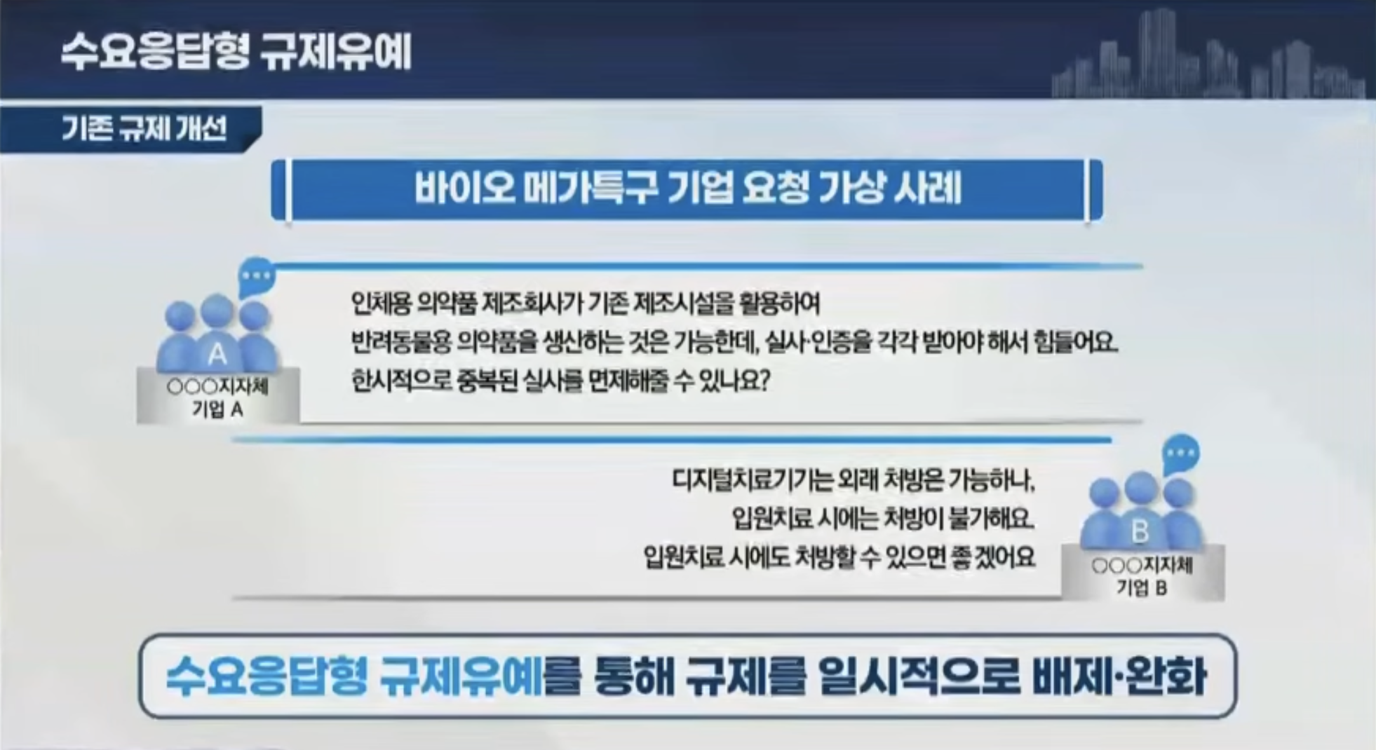사전에 마련된 메뉴판에 명시되지 않은 현장의 긴급한 규제 애로사항은 '수요응답형 규제유예(On-demand 특례)'를 통해 신속하게 심의하고 배제한다. 보건복지부는 이 제도를 활용해 그동안 외래 처방만 가능했던 '디지털치료기기(DTx)의 입원치료 시 처방'을 전격 허용하기로 결정했다. 이는 고전하던 디지털 헬스케어 기업들의 수익성 확보와 핵심 임상 데이터 축적에 결정적인 도약대가 될 전망이다. 아울러 인체용 의약품 제조사가 기존 생산 시설을 활용해 반려동물용 의약품을 생산할 때 겪어야 했던 중복 실사 인증 부담도 단번에 해소된다.