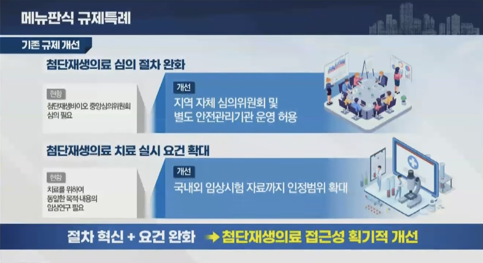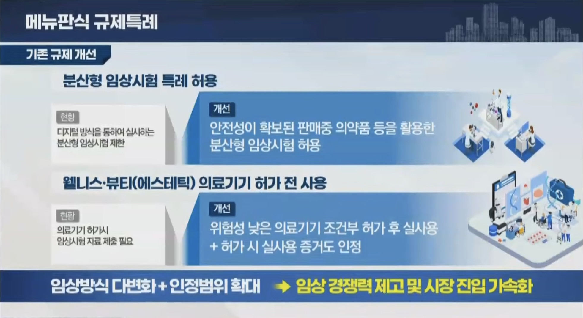 가장 먼저 눈에 띄는 것은 법령 개정 없이도 기업이 필요한 규제 완화 항목을 즉시 선택할 수 있는 '메뉴판식 규제특례(Ready-made 특례)'다. 이를 통해 바이오 특구 내에서는 첨단재생의료 심의 절차가 대폭 완화되고 치료 실시 요건이 확대된다. 특히 물리적 공간 제약을 극복해 신약 개발 속도를 획기적으로 단축할 수 있는 '분산형 임상시험(DCT)' 특례가 전면 허용되며, 웰니스 및 뷰티 의료기기의 허가 전 사용도 가능해진다.