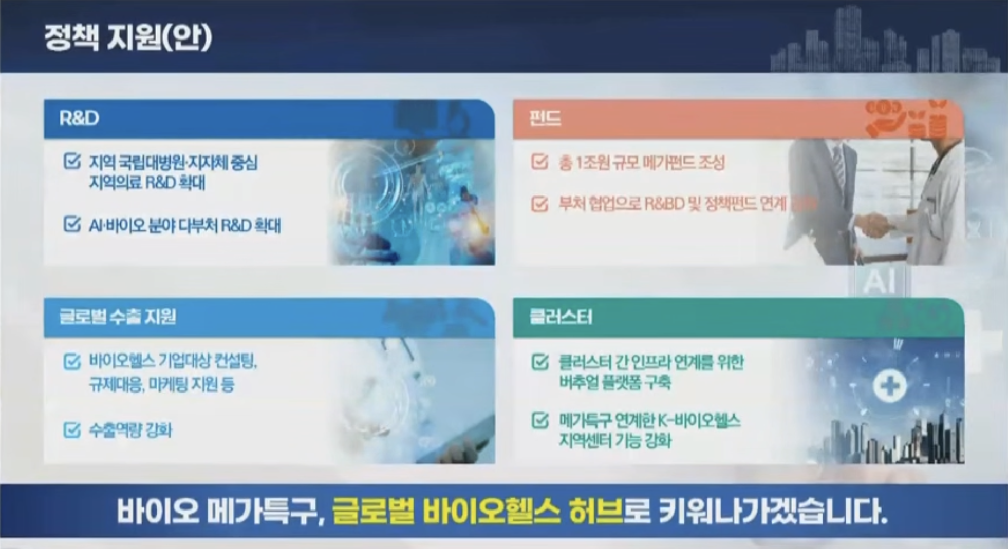 메가특구의 성공을 담보하기 위해 재정, 금융, 세제, 인재, 인프라, 기술·창업, 제도 등 7대 통합 지원 패키지가 동원된다. 바이오 분야의 경우, 국가 핵심 전략산업 육성을 위해 무려 1조 원 규모의 '메가펀드'가 조성된다. 대규모 자본이 투입됨으로써 국내 바이오 벤처의 데스밸리 극복과 차세대 모달리티(RNA, ADC 등) 파이프라인 확보에 숨통이 트일 것으로 보인다.