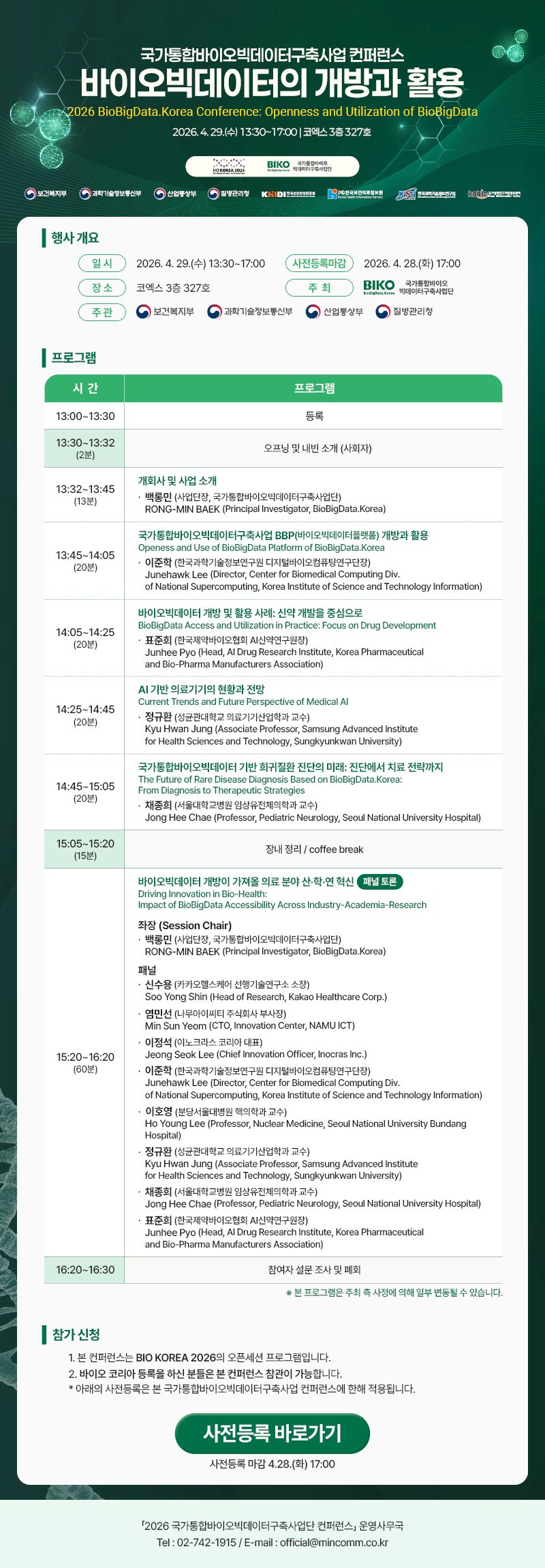 특히 제약 및 디지털 헬스케어 업계의 이목이 집중되는 곳은 29일 오후 1시 30분 코엑스 3층 327호에서 열리는 컨퍼런스다. ‘바이오빅데이터의 개방과 활용(Openness and Utilization of BioBigData)’을 주제로 열리는 이번 행사는 하반기 데이터 개방에 발맞춰 의료 및 산업 분야의 혁신 방향을 논의하기 위해 기획되었다.