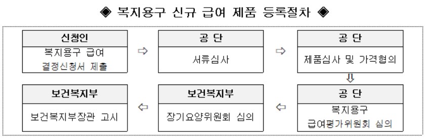 공단은 신청·접수 이후 서류심사를 통과한 신청 건에 대해 제품심사 및 가격협의 등을 실시하며, 복지용구 급여평가위원회 및 장기요양위원회에서 심의해 급여 여부를 결정한다. 급여가 결정된 품목 및 제품은 고시 시행 후 복지용구사업소를 통해 판매 또는 대여가 가능하다.