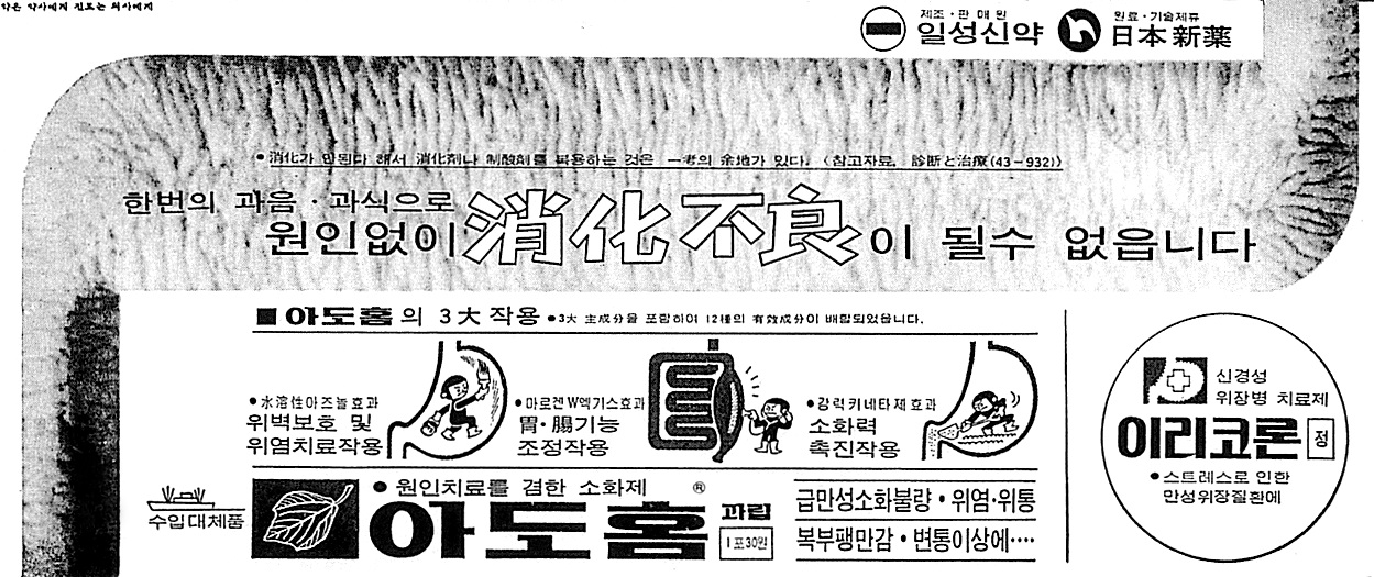 70년대 중반이후 등장해 80년대까지 꾸준히 광고활동을 이어간 일성신약 신경성 위장병 치료제 아도홈은 특이한 광고전략을 보여주었다. 이 제품은 고가의 제품을 강조하는 ‘원료도 비싸고 원가도 비싸 결국 판매가도 비싸다’ 라는 식으로 고품질 고가화 정책을 구사했다.