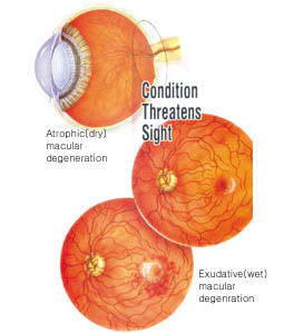 황반변성의 두 가지 형태:노화와 연관된 황반변성의 두 형태로 습성과 건성이 있다. 현재까지 가장 흔한 형태는 건성으로 황반의 조직이 천천히 늘어나 얇아지는, 소위 말하는 위축성 변성이다.