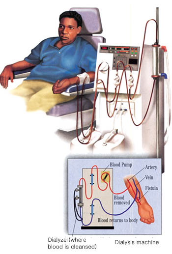 투석:투석은 혈액을 깨끗하게 하는 치료법이다. 투석의 방법은 두 종류가 있으며, 각각장점과 단점들이 있다. 혈액투석은 주로 외래투석센터에서 투석기계를 통해서 혈액을 여과시킴으로써 혈액에 있는 노폐물을 제거한다. 환자는 1주일에 3회 정도 투석을 받게 되며, 한번 투석받는 시간은 3~5시간 정도 소요된다. 일부 상황에서는 투석을 숙련된 보조자와 함께 집에서 시행하는 경우도 있다. 일부 환자들은 투석하는 동안 혈압의 변화, 오심, 근육통과 같은 증상을 경험하기도 한다. 혈액투석을 받는 환자는 혈액에 있는 노폐물이 매일 제거되는 것이 아니기 때문에 특이 식이요법을 처방받게 된다. 복막투석은 복부에 있는 관을 통해 액을 흘러 보냄으로써 혈액에 있는 노폐물을 제거한다. 환자는 감염에 걸리지 않고 복막투석을 시행할 수 있어야만 한다. 복막투석의 장점은 혈액을 매일 깨끗하게 함으로써 노폐물의 축적이 없으므로 환자가 보다 정상적으로 식이를 할 수 있게 된다.