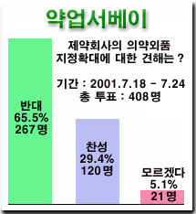 약업닷컴이 지난 18일부터 24일까지 네티즌을 대상으로 제약사의 의약외품 지정확대에 대한 견해를 물은 설문조사한 결과 참여자 408명중 65.5%인 267명이 반대한다고 응답했다.