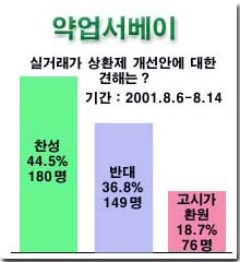 36.8%인 149명은 반대 의견을 개진했으며 76명(18.7%)는 실거래가상환제 이전의 고시가상환제로 환원시킬 것을 주장했다.