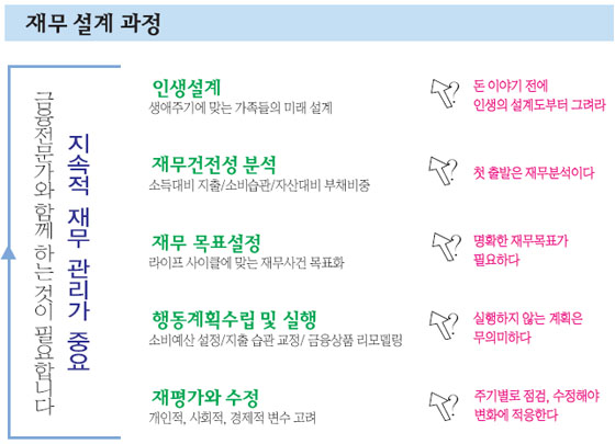 재무 설계는 아래의 그림과 같이 전문가와 더불어 라이프 사이클에 맞는 나와 가족의 미래를 설계하는 과정이다. 소득 대비 지출의 적정성을 파악하여 불필요한 지출을 통제하는 일련의 과정을 통해 건전한 소비 습관을 정착하고, 자산대비 부채 비중의 합리적 수준을 결정하는 등 가계의 재무건전성을 확보한다. 또한 라이프사이클에 맞는 재무 목표를 설정하며 소비예산의 설정 및 지출 습관의 교정과 금융 상품의 리모델링 등을 통해, 행동 계획의 수립 및 실행을 가능하게 해준다.