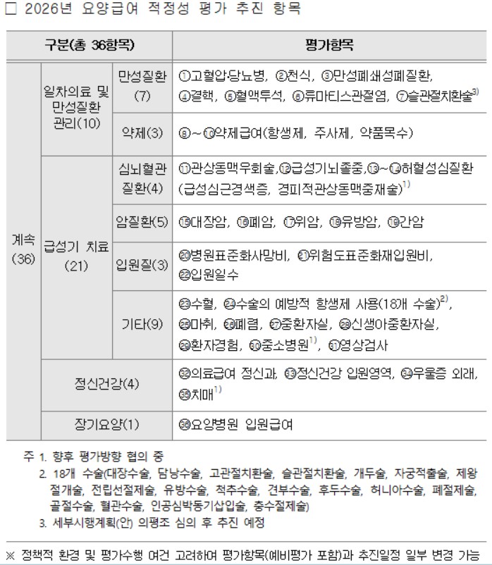건강보험심사평가원이 질환별 지표 중심이던 요양급여 적정성 평가를 치료 성과와 보상 연계를 강화한 평가 체계로 전환한다. 2026년 적정성 평가는 총 36개 항목을 유지하되, 평가 방식과 활용 구조를 손질해 의료 현장의 실질적인 질 향상과 국민 체감도를 높이는 방향으로 운영된다.