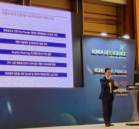 - 신한투자증권 헬스케어팀 한종수 부장이 30일 서울 코엑스에서 열린 ‘코리아 라이프 사이언스 위크 2025’ 부대행사의 연사로 나서 발표...